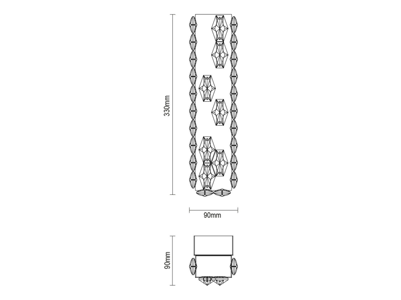 Svietidlo je vyrobené z vysokokvalitného nerezového kovu s chrómovou povrchovou úpravou, doplnené o precízne brúsené kryštály, ktoré umocňujú odraz a lom svetla. Použitá technológia spracovania zabezpečuje dlhodobú stabilitu materiálu a zachovanie jeho estetického vzhľadu.